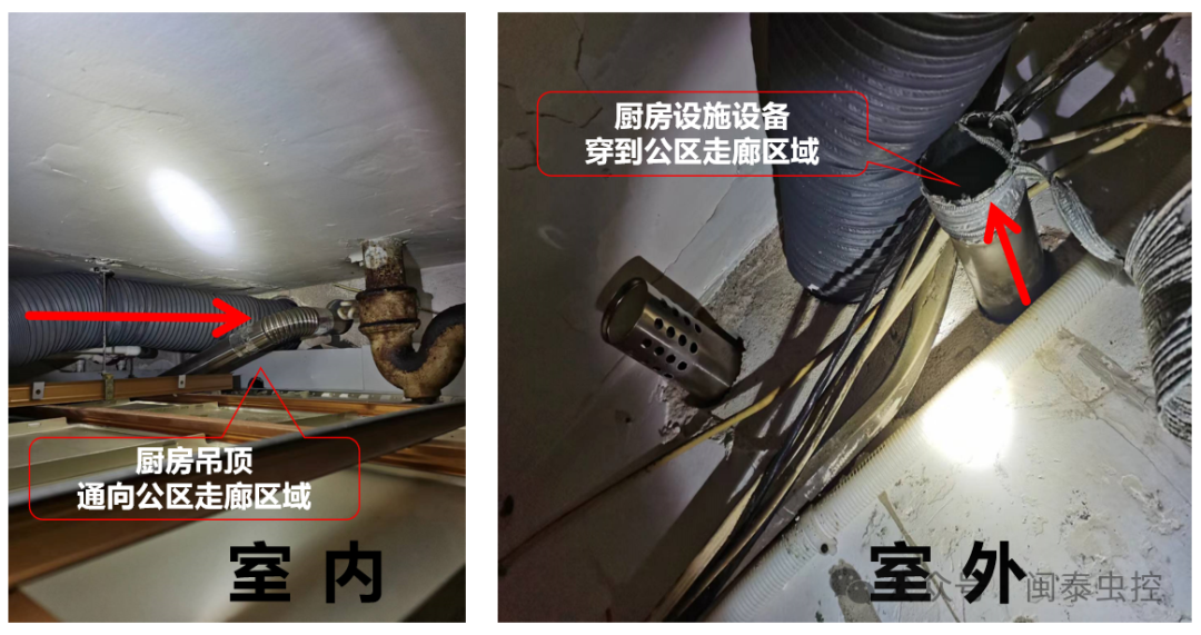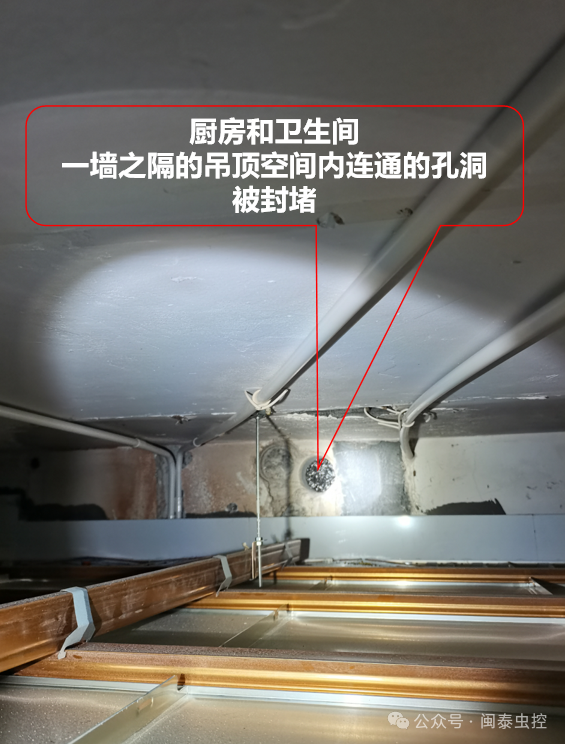 為此除蟲公司的專業(yè)人員通過戶主家的設(shè)備設(shè)施布局,逐一仔細(xì)檢查后發(fā)現(xiàn),該戶主家向公區(qū)走廊處的熱水器排氣管對外排氣形成的穿墻孔洞存在一定的鼠攀爬侵入的風(fēng)險。以及廚房和衛(wèi)生間一墻之隔的吊頂空間內(nèi)有連通的孔洞留存。